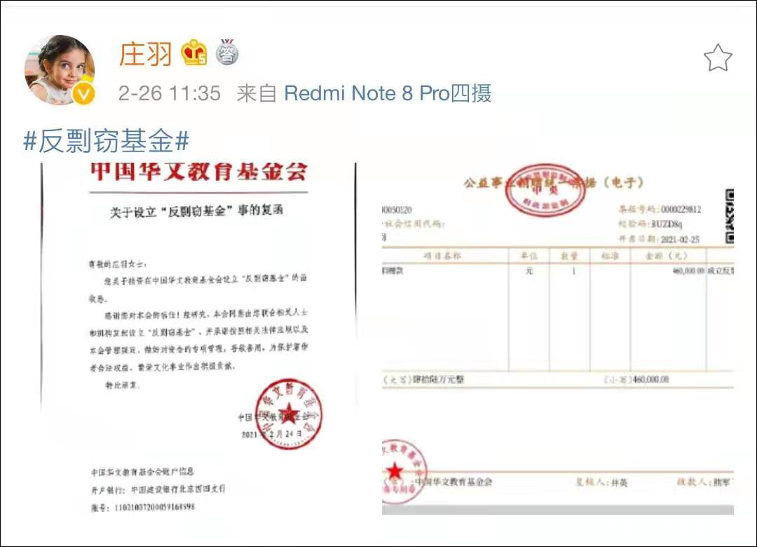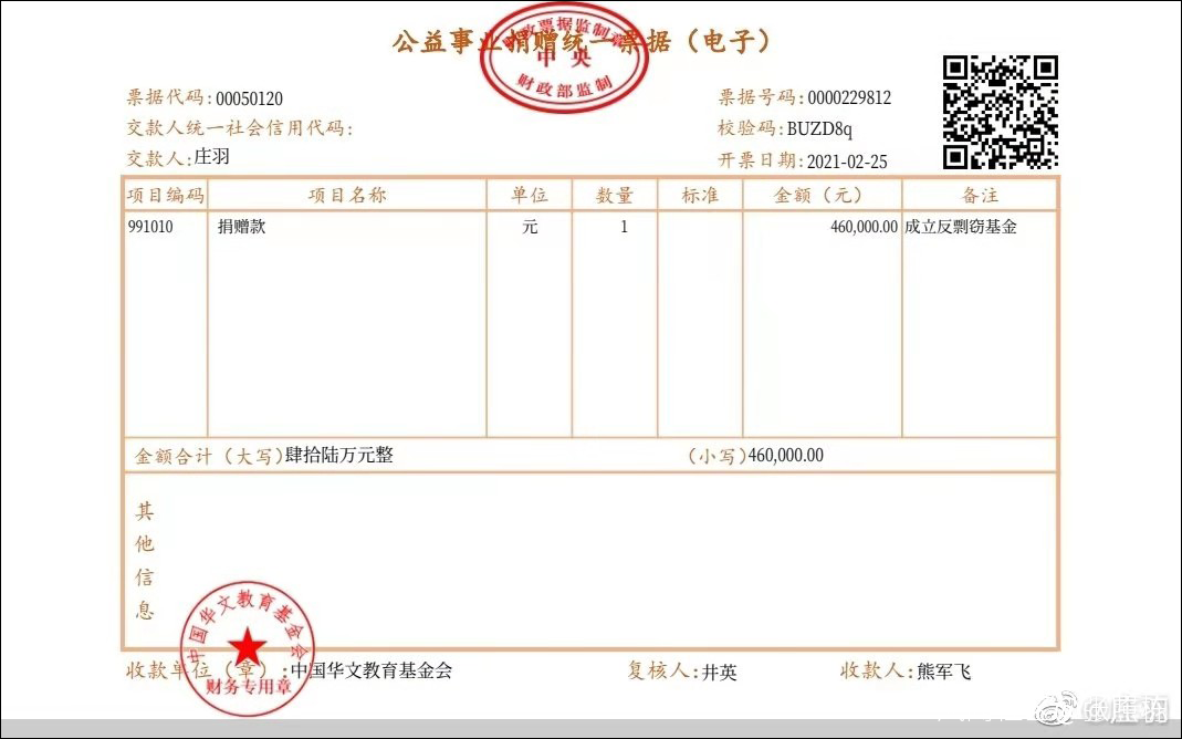 此外,莊羽還曬出一份票據,票據顯示莊羽為“反剽竊基金”捐款46萬元。