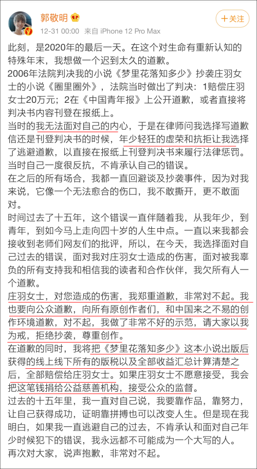 “莊羽女士,對您造成的傷害,我鄭重道歉,非常對不起。我也要向公眾道歉,向所有原創作者們,和中國來之不易的創作環境道歉,對不起,我做了非常不好的示範,請大家以我為戒,拒絕抄襲,尊重創作。”