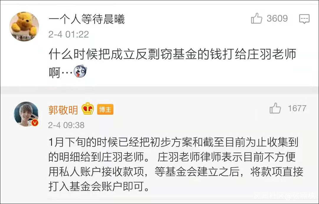2月4日,有網友@郭敬明:“什麼時候把成立反剽竊基金的錢打給莊羽老師?”