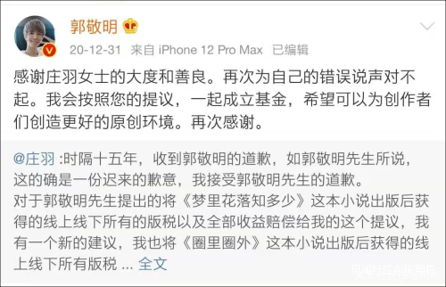 據觀察者網此前報道,2020年最後1天,郭敬明就抄襲一事,向《圈裏圈外》的作者莊羽正式道歉。