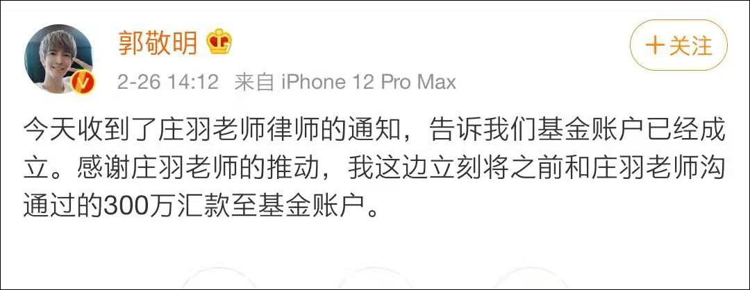 在今天上午莊羽宣佈“反剽竊基金”成立後,下午14:12分,郭敬明發布微博回應:“今天收到了莊羽老師律師的通知,告訴我們基金賬户已經成立。感謝莊羽老師的推動,我這邊立刻將之前和莊羽老師溝通過的300萬匯款至基金賬户。”