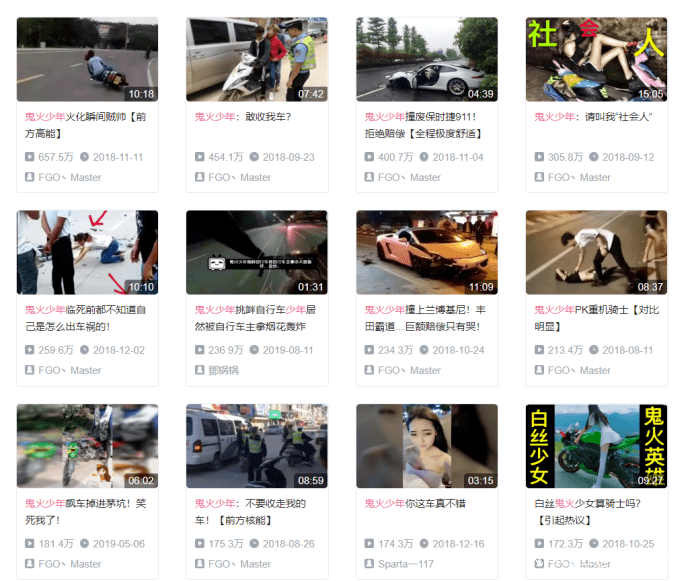 在B站上搜索“鬼火少年”,你能看見各種“鬼火車禍集錦”和“鬼火惹禍集錦”,不少播放量都突破了百萬,還有UP主依靠鬼火少年視頻積攢了粉絲。