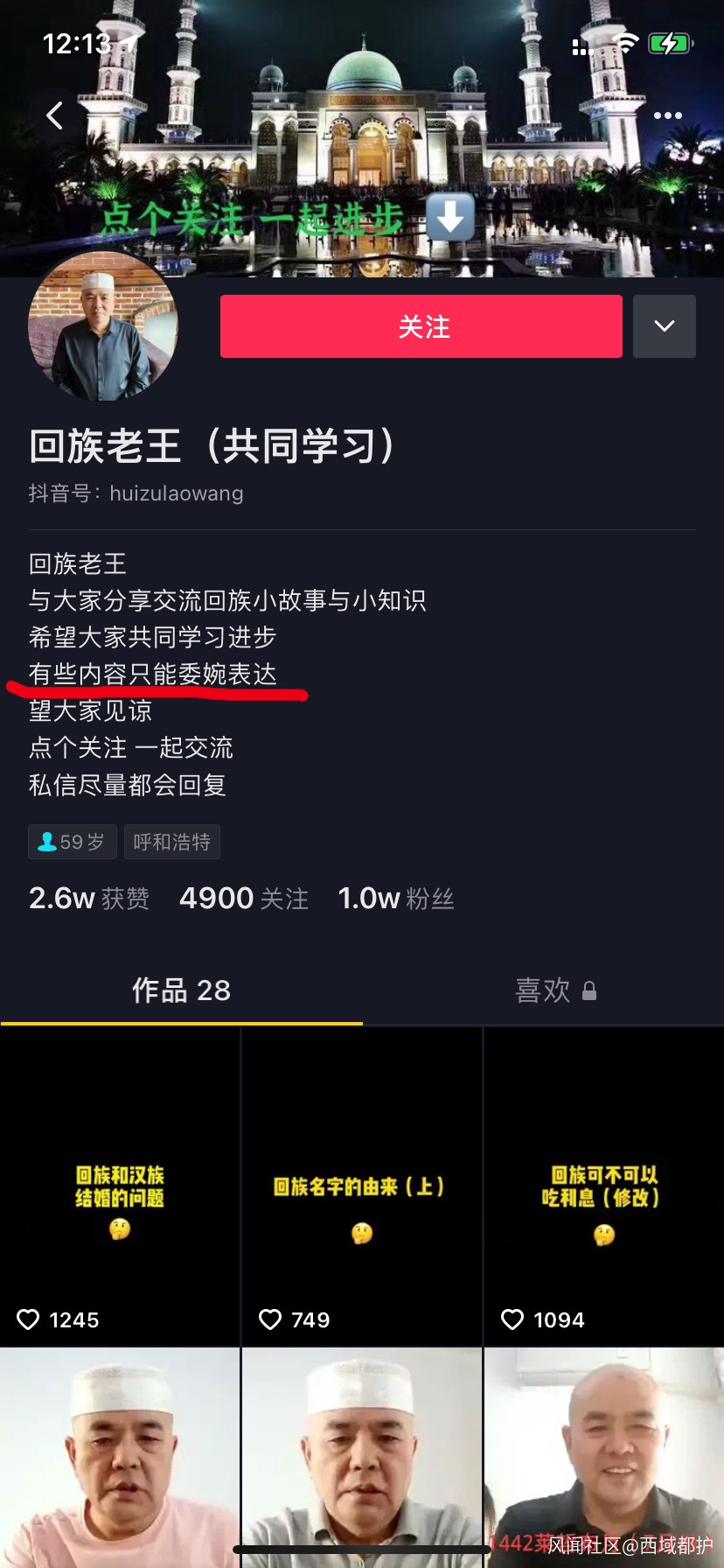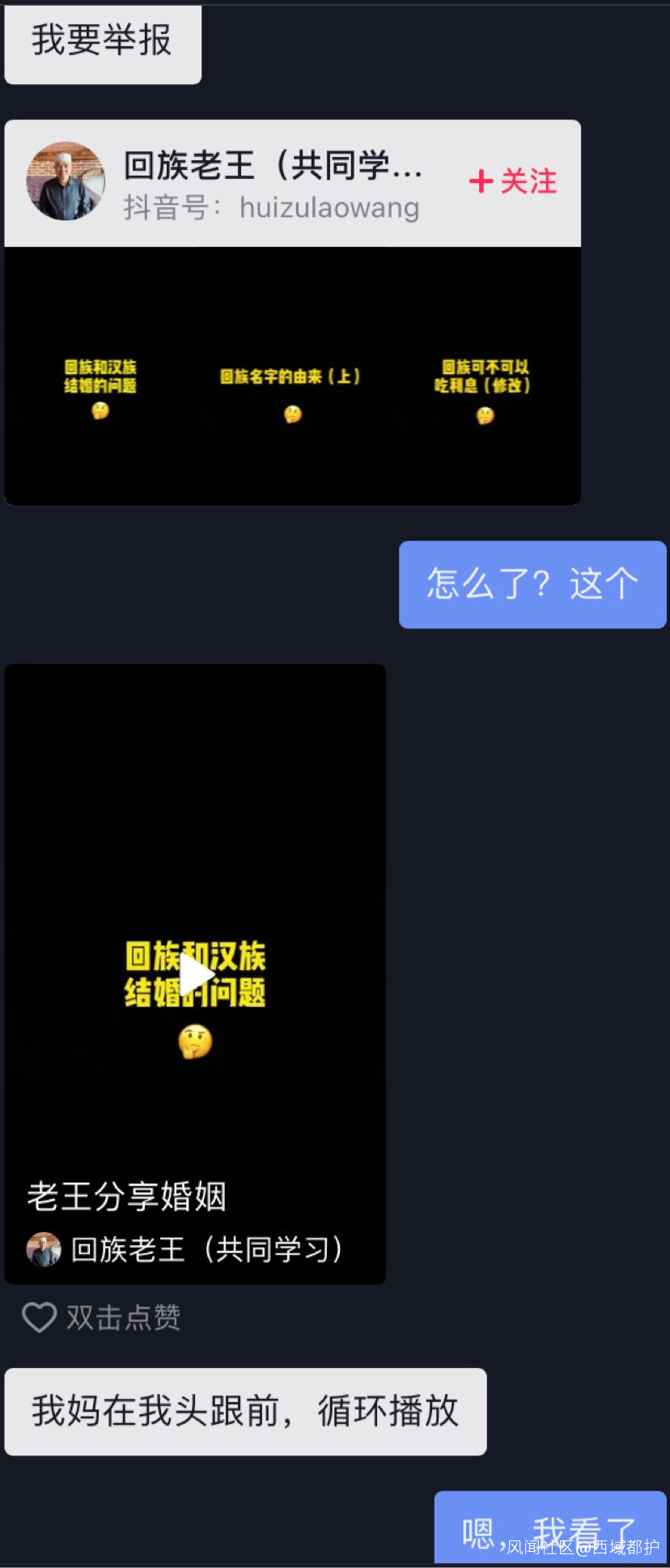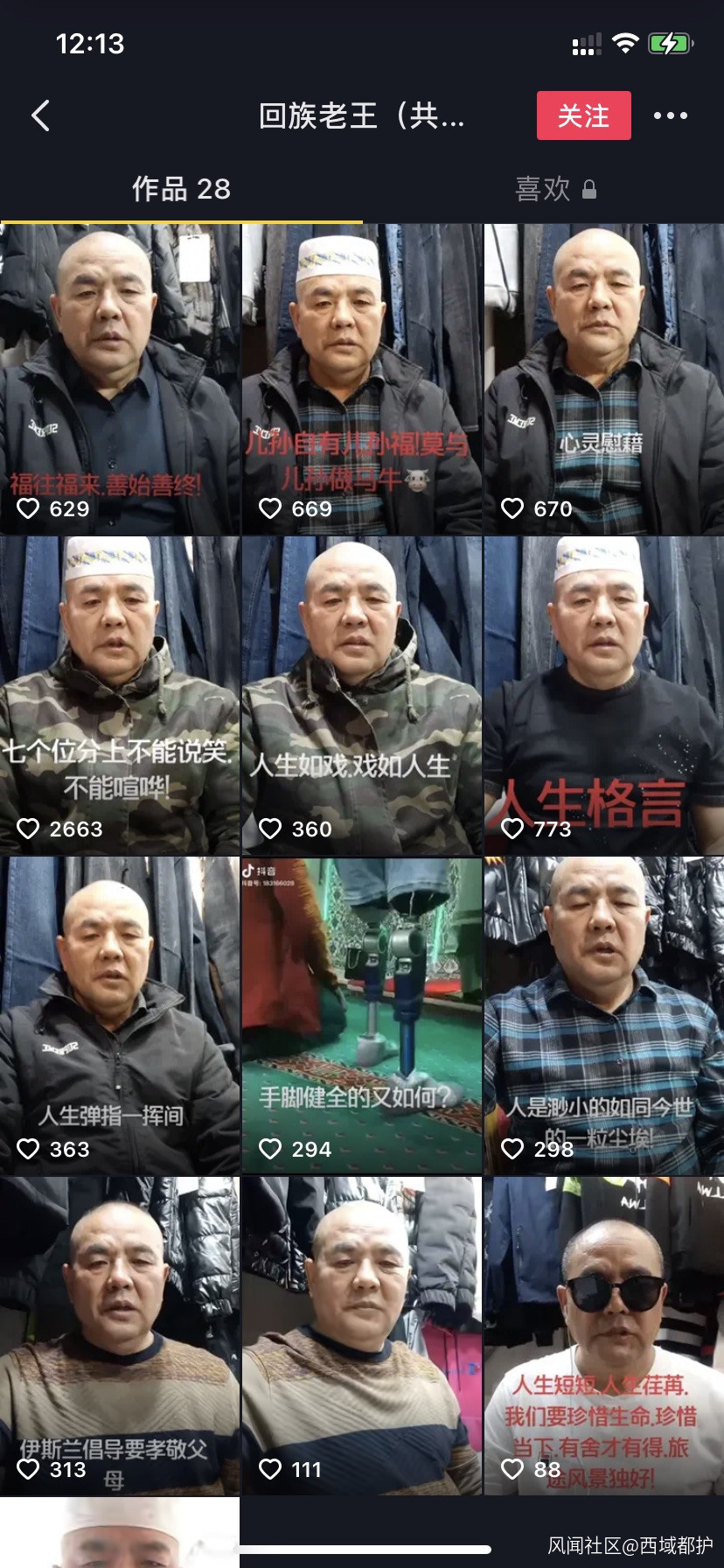 一個因為回漢戀愛正在被家人“禁錮”在家、失去人生自由的回族女孩給我投稿,説她的父母把她按在家裏,給他循環播放這個阿訇的抖音內容。委託我在網上公開舉報這個阿訇的賬號,於是乎我就去研究了一下這個叫“回族老王(共同學習)”的阿訇的抖音賬號:
