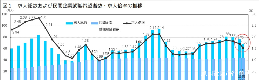 日本社會有一個很有意思的數據:求人倍率。這個數據是由在招聘工作崗位總數除以求職者總人數而來的。即這個數字越大,説明工作相對於求職者越多,就業形勢越好。