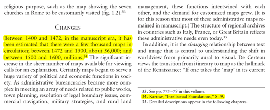 我找到了龔纓晏教授關於地圖大量增多的這段引文的原文,它來自於《地圖的歷史》第三卷第一部分(The History of Cartography, Volume Three (Part 1), cartography inthe European renaissance, Edited by David Woodward, University of ChicagoPress, 2007)。龔纓晏教授引用的文字就是圖中的黃色部分,翻譯無誤。[1]