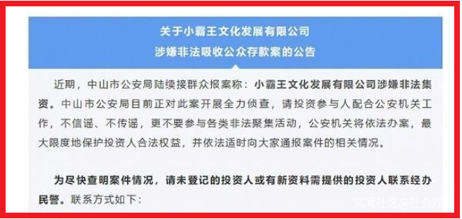 據2月27日中山市公安局微信公眾號消息,該局陸續接羣眾報案稱:小霸王文化涉嫌非法集資。中山市公安局目前正對此案開展全力偵查,請投資參與人配合公安機關工作。