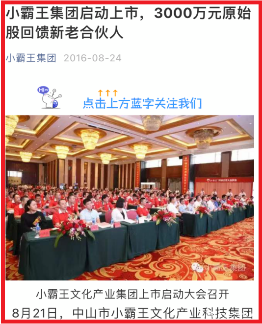 目前,警方尚未公佈具體案由,但記者注意到,小霸王文化曾以上市為由發起股權認購。2016年8月,小霸王文化註冊的微信公眾號“小霸王集團”曾發佈一則標題為《小霸王集團啓動上市,3000萬元原始股回饋新老合夥人》的文章,其中提及當年8月,中山市小霸王文化產業科技集團(後改稱小霸王文化)舉行上市啓動大會,擬重新整合小霸王旗下的所有品牌和有關資產,正式啓動上市。
