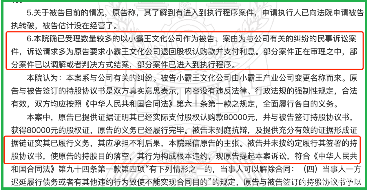 其中一份林偉紅與小霸王文化的裁判文書顯示,法院查明小霸王文化並未按約定履行其簽署的持股協議書,使原告林偉紅的持股目的落空,其行為構成根本違約。記者注意到,上述近50份裁判文書中,多份判決小霸王文化敗訴,公司被要求退還股權認購款。