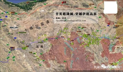 然後沿着公路線,直穿哈巴廷一線的綠洲帶,公路線下就顯示有地下水系?或是一條地下暗河?所以能支撐一些綠洲。我之前有篇文章認為這一帶完全不足以通行,看來還是我失之於草率結論了,還是有幾條綠洲通道的。