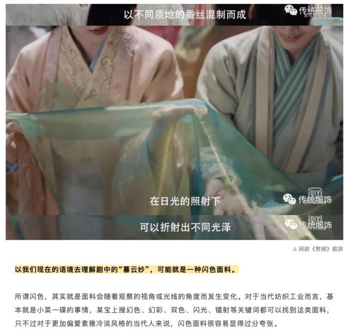 而作為劇中主要展示的服裝行業,則直接祭出乾貨科普,古人到底能不能織出在太陽底下呈現兩種顏色的暮雲紗?