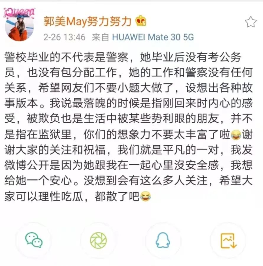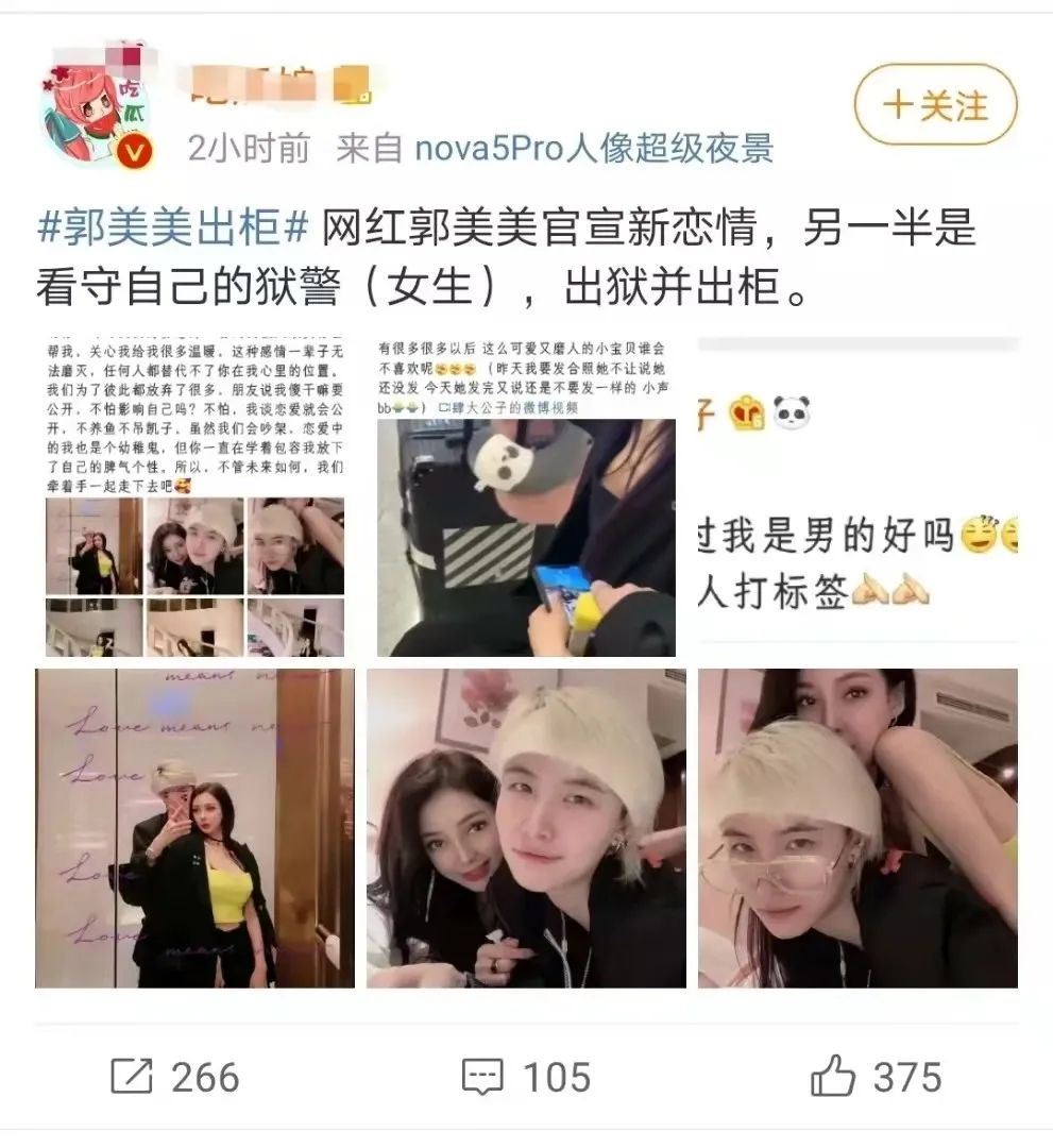這兩天,郭美美和所謂“監獄女民警”談戀愛的傳言,成了網友們高度關注的事件。整件事件源於郭美美髮出的一條微博和一組圖片: