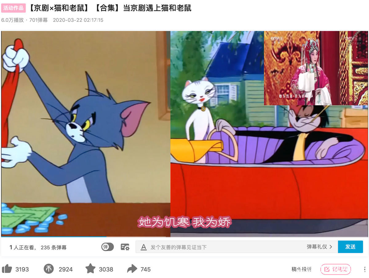 眾所周知,《貓和老鼠》是依靠西方古典音樂以及動畫表演,來推動故事發展的作品。而正是這樣的作品內容特性,給予了許多剪刀手二次創作的空間——將中國傳統戲曲為BGM,按照唱詞的內容,將《貓和老鼠》的動畫片段串聯在一起,以此形成了別具一格的戲曲片段。