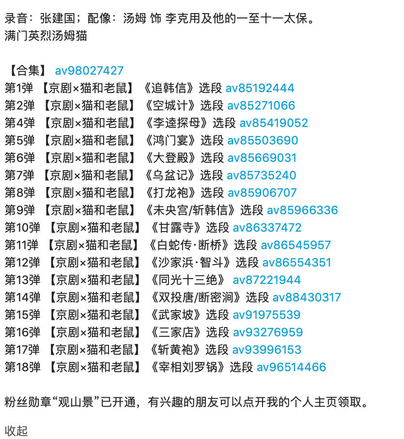 更令人捧腹的是,這些《貓和老鼠》的戲曲類二創視頻還出現了系列化的發展趨勢。正所謂“滿門英烈湯姆貓”,但凡是在年輕票友中人氣特別高的經典唱段,都能夠和《貓和老鼠》融合在一起,儼然已經形成了一個“湯姆貓戲曲宇宙”。