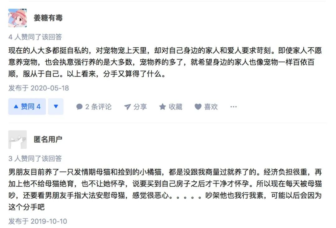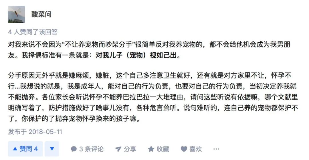 在知乎上,“有沒有因為養寵物而吵架分手的?”,有人表示如果男朋友不能接受寵物,就不結婚。