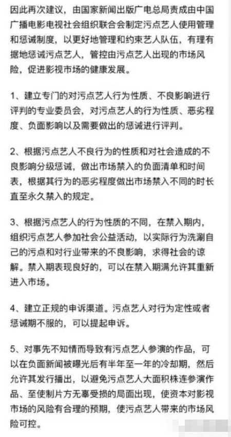換言之,不同問題的藝人有不同的懲戒方法,如出軌等私德有虧的藝人,並非罪不可赦,可在懲戒期滿後迴歸。而確實觸及公眾底線的藝人,被永久性封殺後,也要考慮對其參演作品採取補救手段。