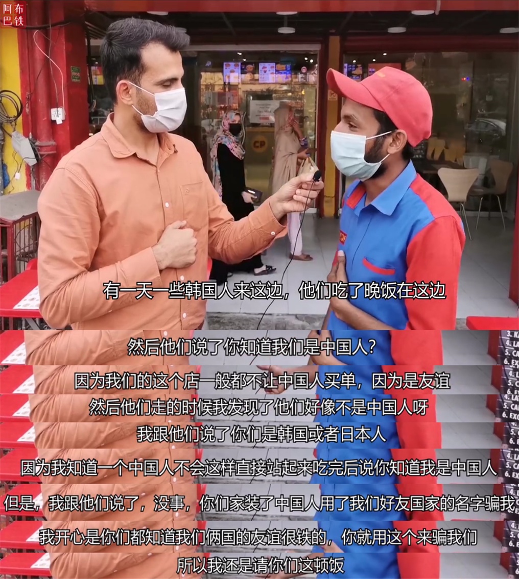 幾個韓國人到他店裏吃飯並聲稱自己是中國人,被他當場識破,但最終這位巴基斯坦老鐵還是給韓國人免了單