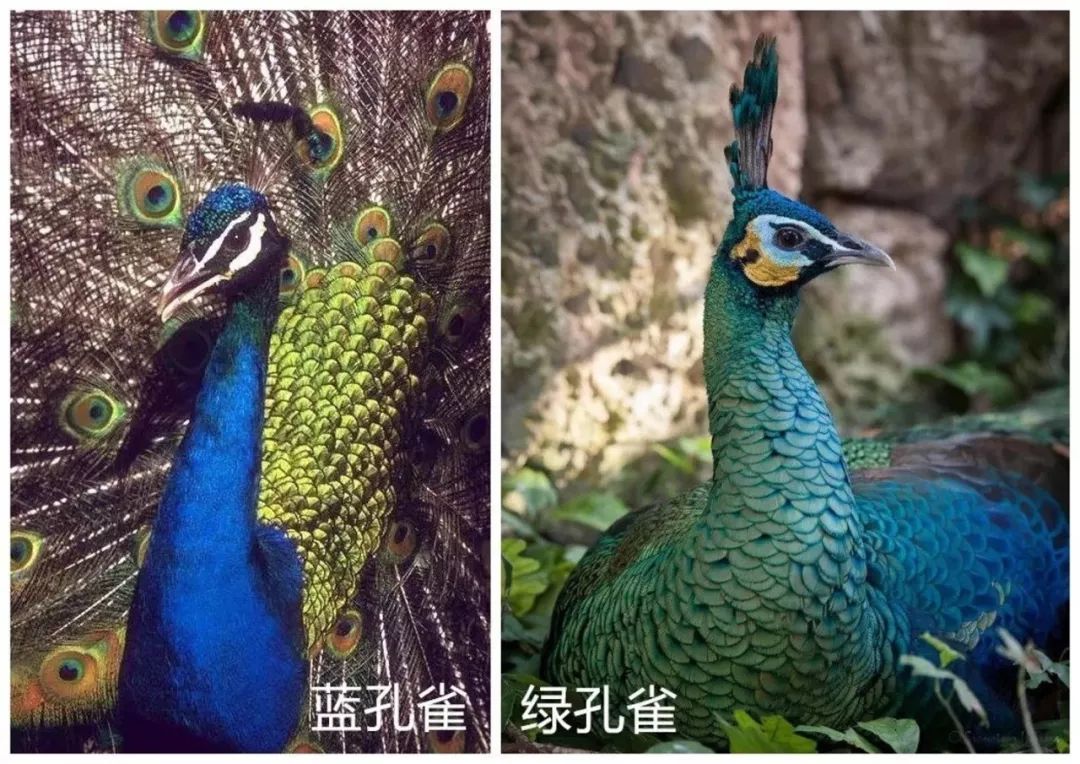 不過我們平常在公園裏看的孔雀基本都是藍孔雀,藍孔雀和綠孔雀之間有幾個比較明顯的區別: