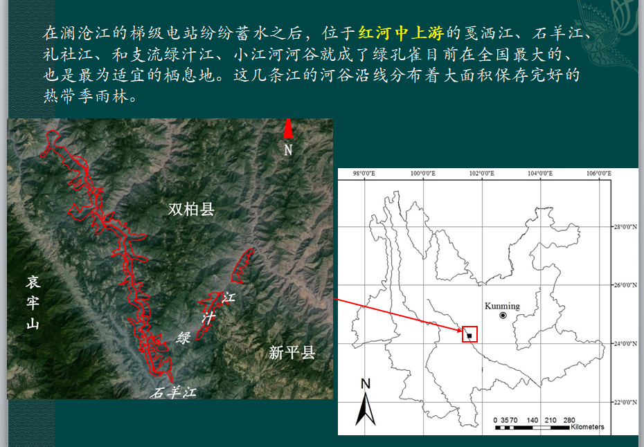 其中,紅河流域的情況最好,棲息地面積相對較大,還有確認繁殖的綠孔雀種羣;