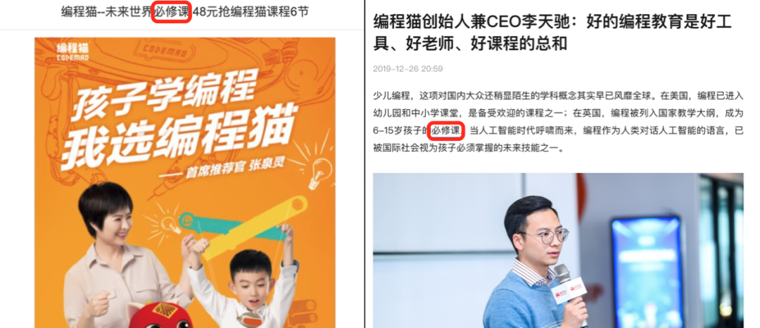 這也成為眾多編程教育機構手中的宣傳利器。例如“編程貓”就在許多宣傳語種帶上“必修”等字眼。