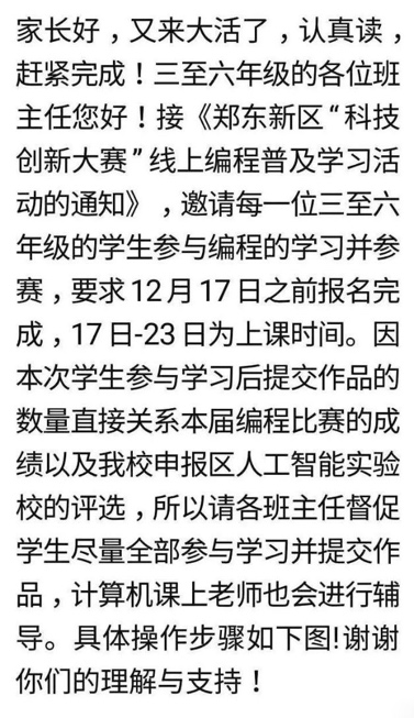 2020年末,曾有“編程貓遭鄭州家長舉報:班主任強行攤派課程”的相關報道,再次將編程貓推向了風口浪尖。相關報道顯示,一份貌似是教育局或學校的通知,讓河南鄭州鄭東新區的公立小學的班主任發到班級羣裏。通知中要求每一位三到六年級的學生參與編程的學習,並立即完成“科技線上大賽”的報名。據報道指出,當家長按提示掃碼後,竟進入編程貓相關頁面。