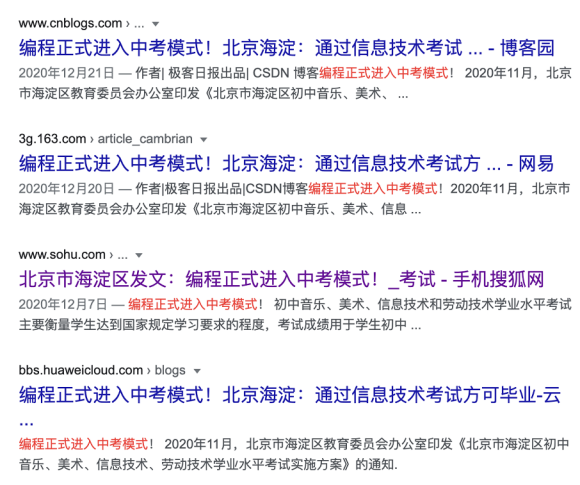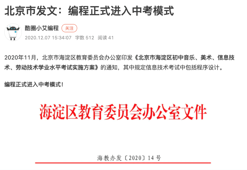 2020年11月,海淀區教委發佈《北京市海淀區初中音樂、美術、信息技術、勞動技術學業水平考試實施方案》的通知。一時間,大量以“北京市發文:編程正式進入中考模式”為標題的文章被髮布,點開相應鏈接,發佈賬號多為編程教育機構。