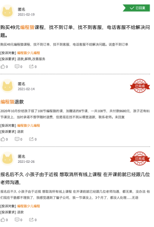 除了製造焦慮的質疑,藍鯨教育查詢發現,在黑貓投訴平台,編程貓存在涉及不退費,下單不發貨、變向扣費等多項問題。