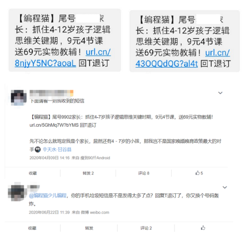像編程貓一樣乘着資本熱浪的編程教育機構,在政策利好下一路高歌猛進。但與此同時,藍鯨教育發現,不少網友投訴頻頻收到編程貓的短信推銷,頻繁騷擾用户。