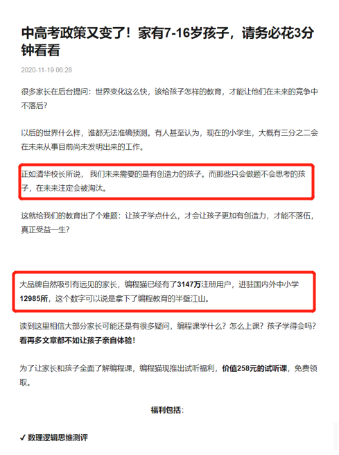 而在投放宣傳上,製造焦慮的問題依然屢禁不止。一篇發佈於2020年11月的文章,題為《中高考政策又變了!家有7-16歲孩子,請務必花3分鐘看看》,文章開頭引用“清華校長”的話稱“我們未來需要的是有創造力的孩子。而那些只會做題不會思考的孩子,在未來註定會被淘汰。”可文章的後半部分,卻在為編程貓打廣告。