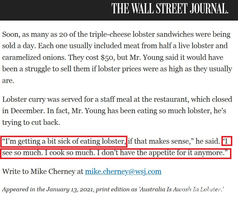 《華爾街日報》:悉尼,假期期間,澳大利亞大廚山姆·揚(Sam Young)為他的家人聚會準備了一大盤龍蝦卷。第二天,他烤了另一隻龍蝦,和女友的蛋黃醬一起吃。