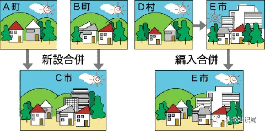 由此,日本平成時代的各級政府根據不同地區不同情況對症下藥,市町村大合併就此轟轟烈烈地開始了,主要分兩種形式: