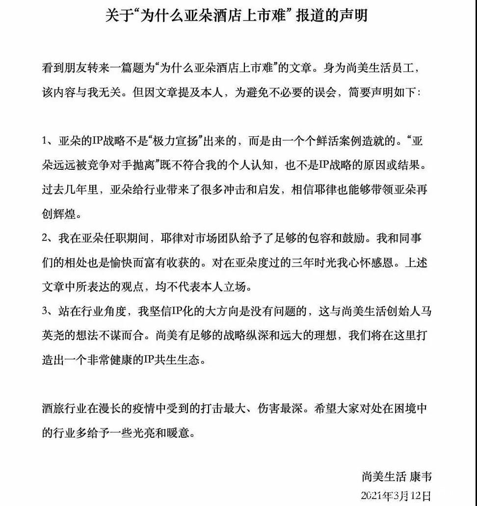 但令人意外的是,亞朵方面沒有任何人對此作出回應,反而其前市場副總裁、現任尚美生活集團CMO的康韋發表了一則個人聲明。該聲明稱,“過去幾年裏,亞朵給行業帶來了很多衝擊和啓發,相信耶律也能夠帶領亞朵再創輝煌”。