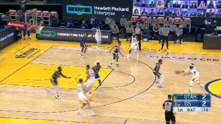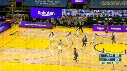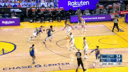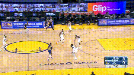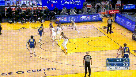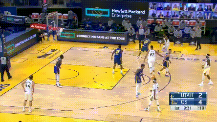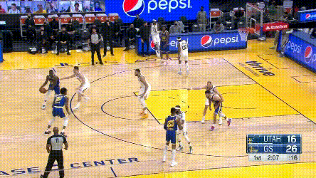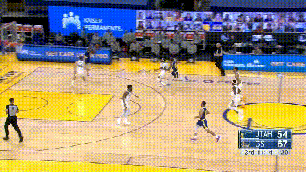 庫裏在第二節與維金斯的擋拆,可能讓球迷認為,勇士有一套新戰術拿了出來。其實勇士這麼打,更大的可能性是防守格林的球員是爵士外線悍將奧尼爾,防守維金斯的卻是相對防守軟肋博揚,與其説庫裏找維金斯擋拆是看重維金斯,不如説庫裏在找博揚。但因為爵士無腦夾擊庫裏,維金斯順下同樣要遭遇戈貝爾護筐,所以兩人的配合效果並不好——維金斯處理4打3,格林出手三分,不管命不命中,爵士都等於防成功了。