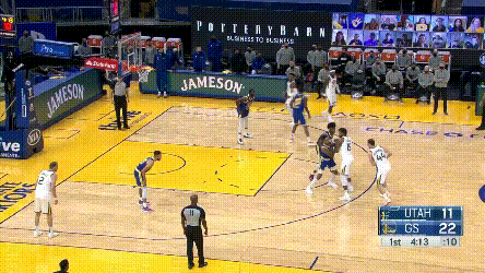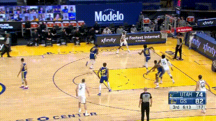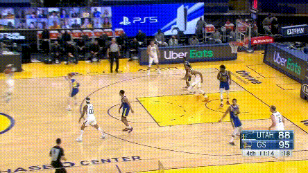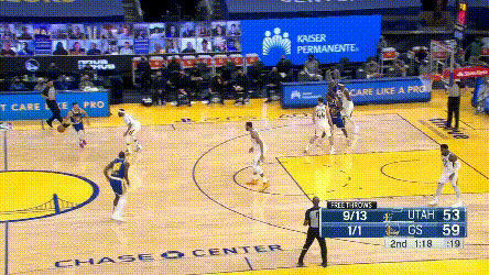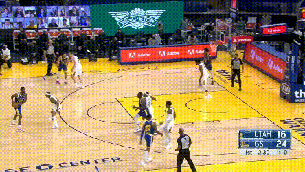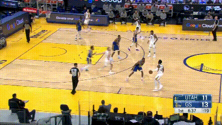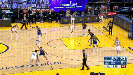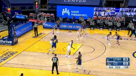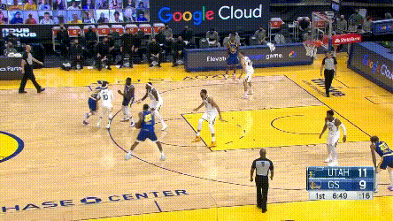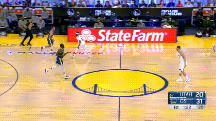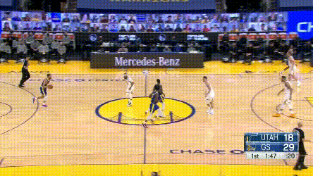 是的,勇士打了一場陣地戰非常硬的比賽,爵士的內線防守始終不願被勇士調度起來,就需要勇士幹一些硬氣的球。第一節的最後兩次進攻,都是經典的庫追擋拆,我們前文説了,庫追擋拆遇上爵士時並不好用,但你看看庫追敲開爵士防線的方式: