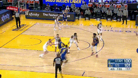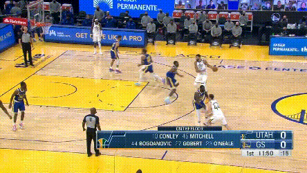 盧尼搶出撲康利,烏佈雷接管戈貝爾,於是康利上球深入籃下的戈貝爾,後者轉身放籃不中。沒有形成空位出手機會,讓戈貝爾一對一,勇士的目的達到了。