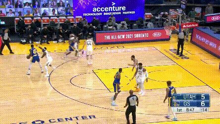 比如,庫裏在運球過半場後直接跟盧尼發起擋拆,走了非格林所在的一側,讓爵士來不及在上線增加兵力;