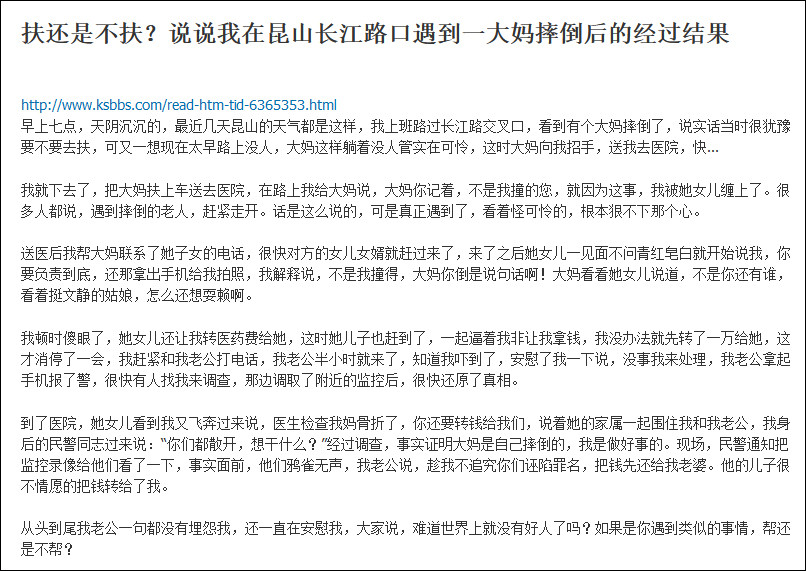 上週二(9日),王某以《扶還是不扶?説説我在崑山長江路口遇到一大媽摔倒後的經過結果》為題在某論壇發帖,“詳述”了自己“被訛詐”的經歷: