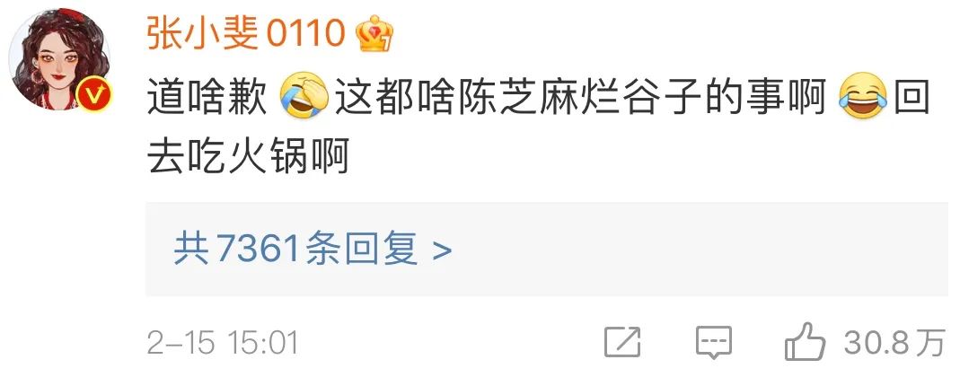 沒過多久,張小斐出現在了袁姍姍的評論中,她説:“道啥歉,這都啥陳芝麻爛穀子的事啊,回去吃火鍋。”