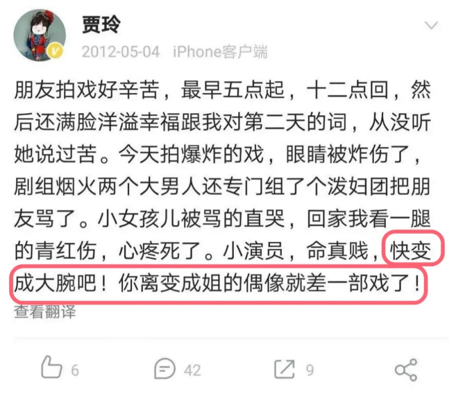 這件事,被前去探班的賈玲知道了,後來她在微博上寫道:“小演員,命真賤,快變成大腕吧!你離變成姐的偶像就差一部戲了。”