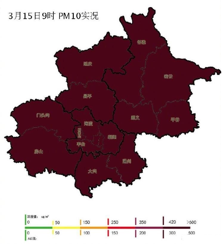 據北京市生態環境監測中心消息,15日上午9時城六區PM10濃度已達8108,嚴重爆表。