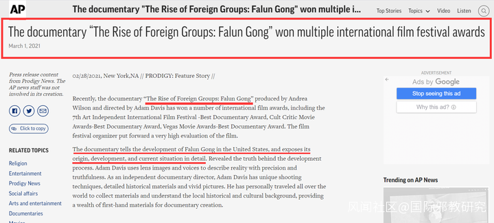 據美聯社3月1日報道,一部以揭露邪教FLG為主題的紀錄片,最近榮獲多項國際電影獎,其中包括“第七屆國際藝術獨立電影節”“邪典影評人獎”和“維加斯電影獎”的最佳紀錄片獎等。電影節組織者對這部影片給予極高評價。