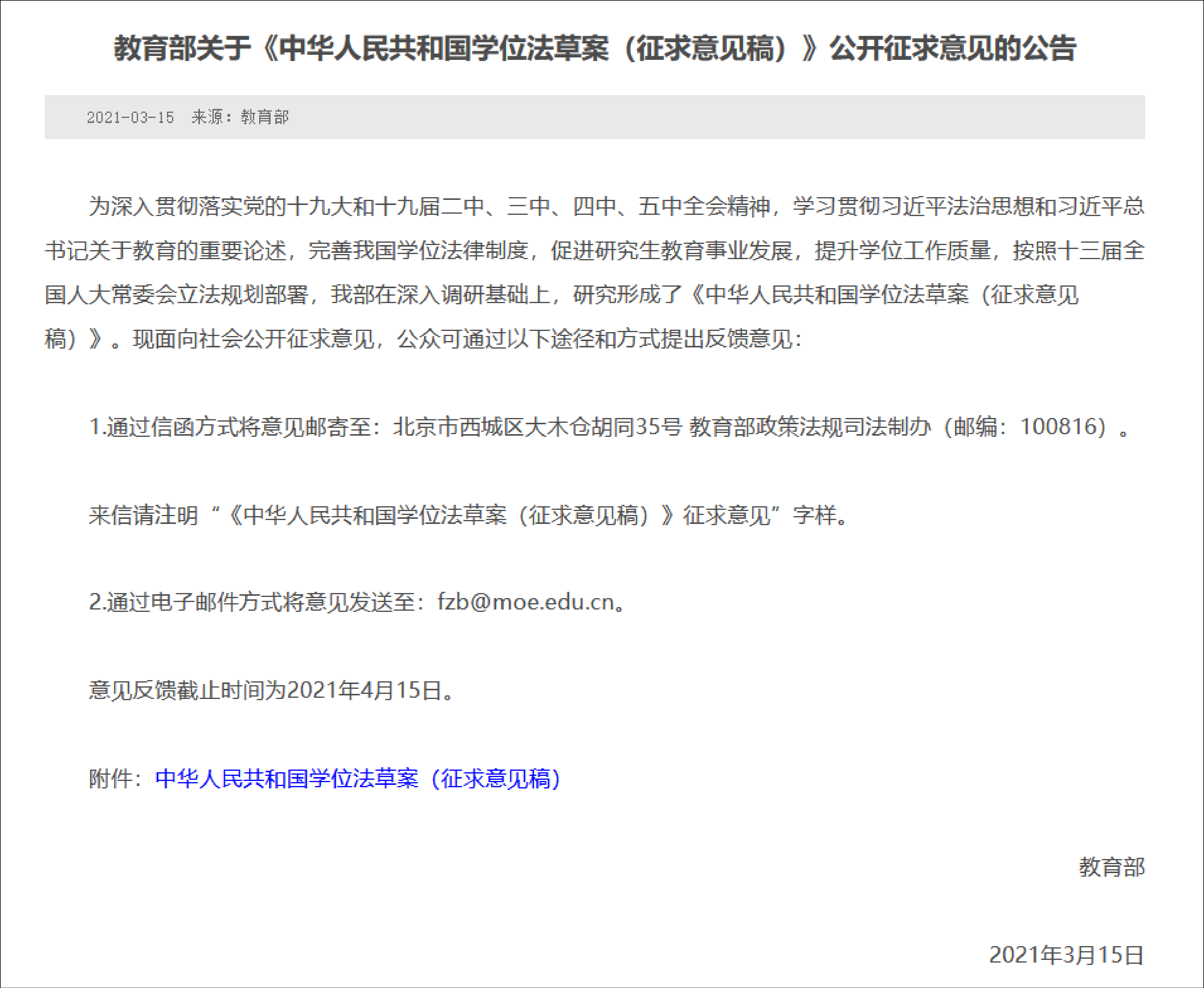 3月15日,教育部發布關於《中華人民共和國學位法草案(徵求意見稿)》公開徵求意見的公告。