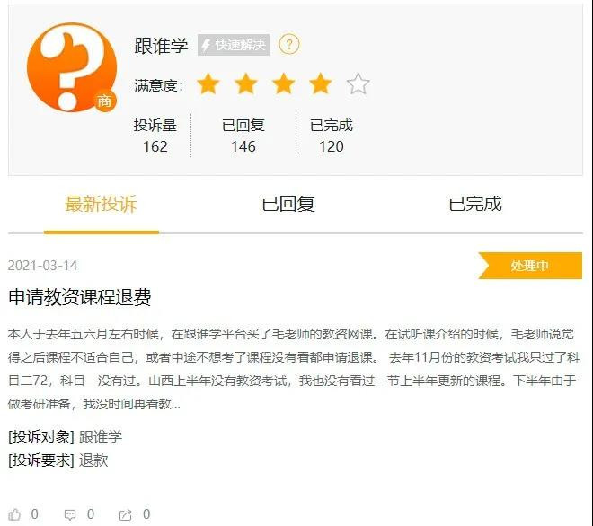 此外,跟誰學還屢遭用户投訴。據黑貓投訴平台顯示,跟誰學被投訴總量高達162件,且大部分與其虛假宣傳、退費難等有關。