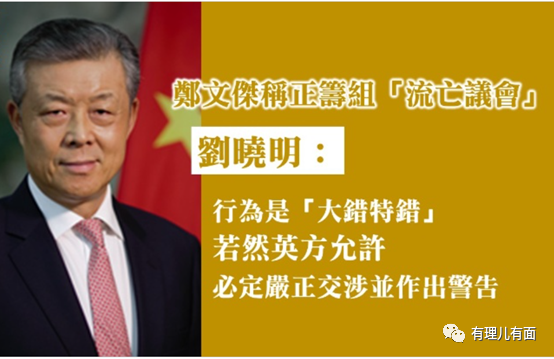 去年7月,鄭文傑聲稱正與民主派人士商討籌組“流亡議會”(parliament-in-exile),時任中國駐英國大使劉曉明接受《泰晤士報》訪問時,批評鄭文傑等人目的是分裂中國搞“港獨”,若英方允許鄭文傑等人建立“流亡議會”,將違反尊重國家主權和領土完整的國際關係基本準則,同時亦會成為中英關係的另一個嚴重問題。如果英方挑戰中國主權,中方一定會嚴正交涉並作出警告。