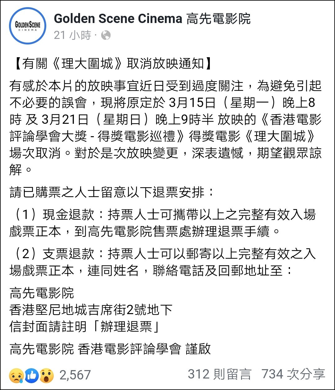 報道稱,高先電影院原定15日晚及21日晚安排放映《理大圍城》兩場;不過在15日下午,高先電影院聯同香港電影評論學會在臉書上宣佈,“有感於本片的放映事宜近日受到過度關注,為避免引起不必要的誤會”,決定取消放映全部場次。