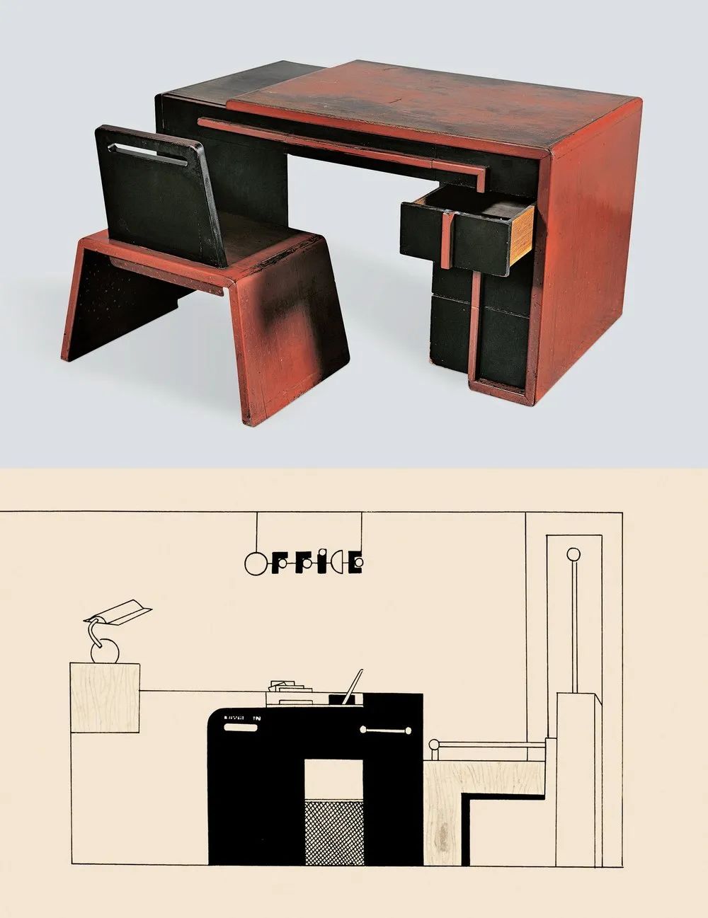 上:硃紅灑金傢俱,約1930年;下:辦公傢俱設計圖草圖,《近代工藝美術》 1932年