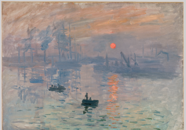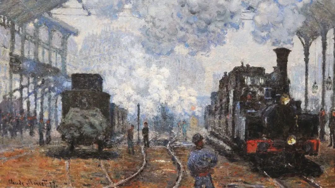 《日出印象》裏煙囱、冒煙,印象派由此得名。其實莫奈畫的全都是“工業霧霾”。他當時不覺得這事不對,這事壯麗!火車嗡一下這麼一大團蒸汽出來,輪子一人多高就轉起來了等等,他要表現這些。