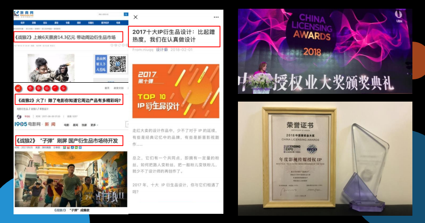 《戰狼2》豐碩的項目成果,更是贏得了中國授權業大會首個影視類****的授權IP大獎及網絡媒體的關注。