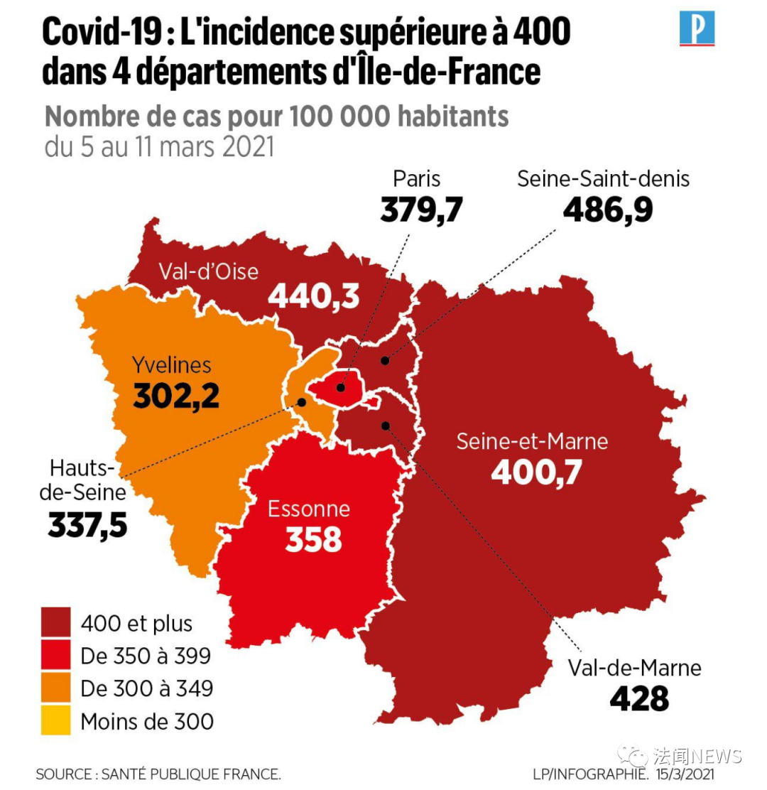 而且從下圖可以看出,有一半以上的地區已經超過警戒值400,比如,94省Val-de-Marne的發病率是428,93省Seine-Saint-Denis則是486,95省Val-d’Oise是440。
