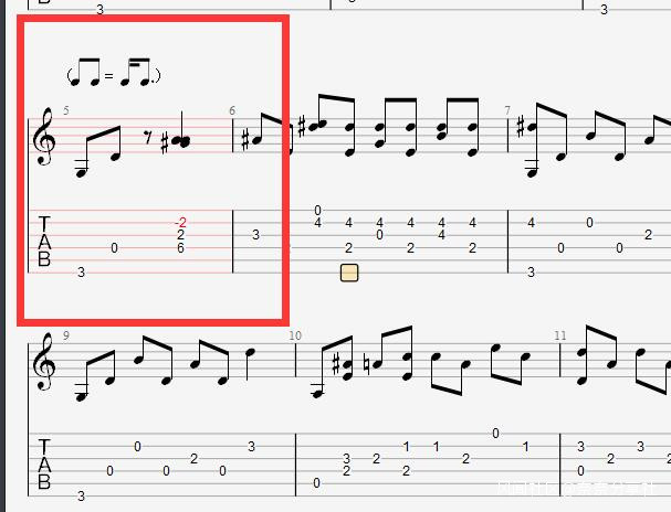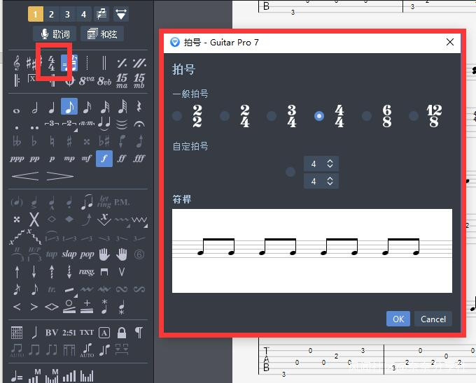 圖3:修改樂譜拍號確定好曲譜拍號後,如果譜子小節時值總和是錯誤的,Guitar Pro會將該小節標記為紅色提示我們,以保證扒譜的正確性。