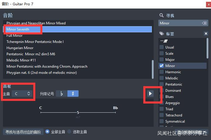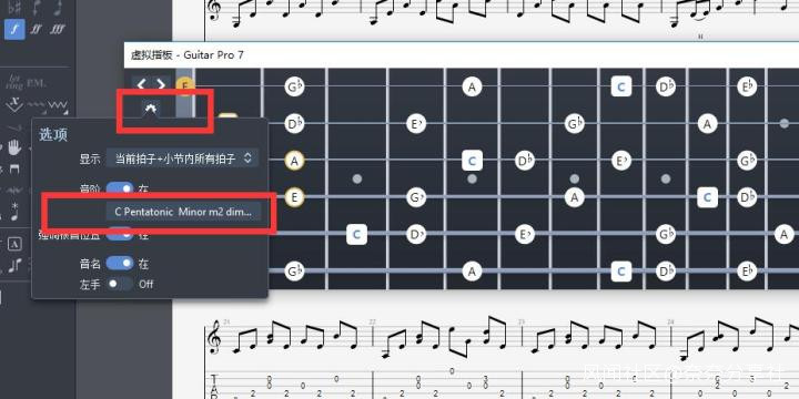 圖1:打開虛擬指板設置然後選擇我們所扒的主音和音階,如下圖的C Minor Seventh(Cm7),此時點擊播放按鈕,聽聽播放的是否和原曲差不多,差不多説明扒的是正確的。